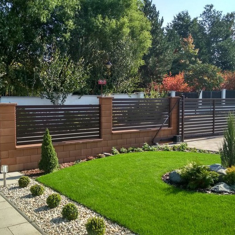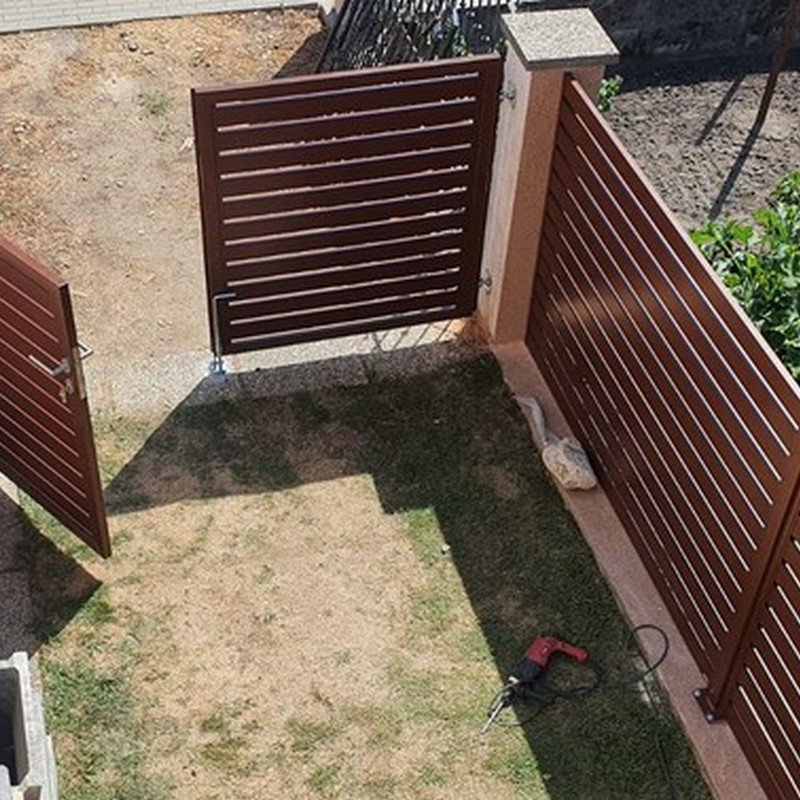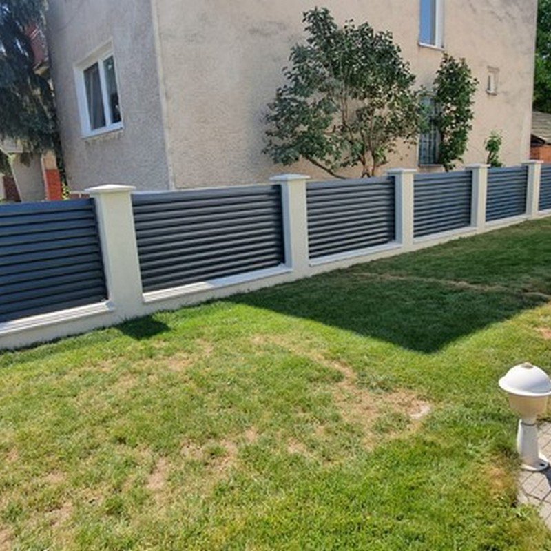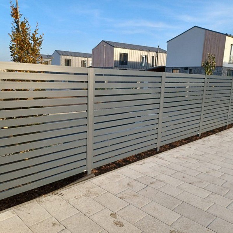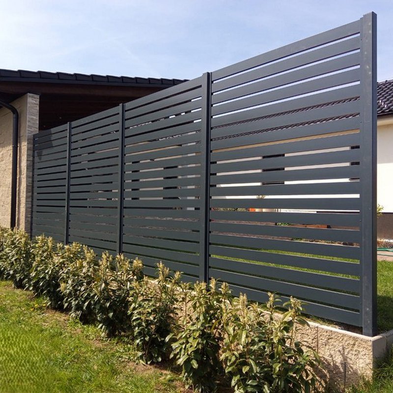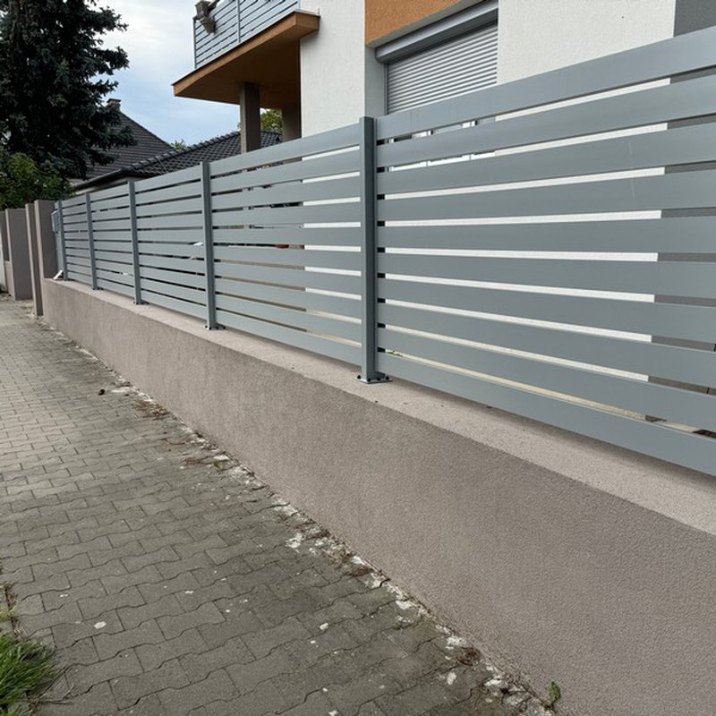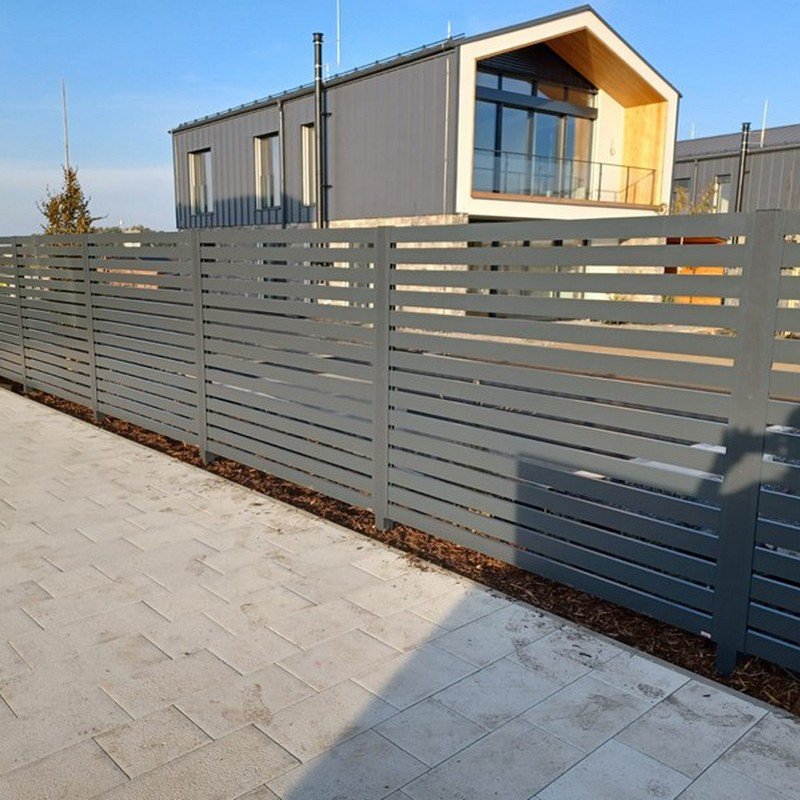 Okenicové hliníkové ploty mají lamely připomínající nedovřené žaluzie. Plot působí vzdušně a přitom poskytuje soukromí.